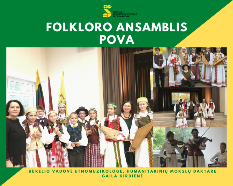 Norinčius išmokti dainuoti liaudies dainas, žaisti, ratuoti, šokti ir groti įvairiais tradiciniais muzikos instrumentais (skambinti kanklėmis, mušti būgną, skudučiuoti, lamzdžiuoti), kviečiame lankyti  5–8 klasių folkloro ansamblį „Pova“. 2018 m. rudenį susibūrusiam ansambliui vadovauja etnomuzikologė, humanitarinių mokslų daktarė Gaila Kirdienė. Ansamblis ir jo nariai dalyvauja mokyklos bendruomenės šventiniuose renginiuose (Kalėdų, Užgavėnių, Sausio 13-osios, Vasario 16-osios, Kovo 11-osios,  Rugsėjo 1-osios, Mokytojų dienos ir kt.). Taip pat sėkmingai dalyvauja ir Vilniaus bei šalies etnokultūros ir folkloro renginiuose, konkursuose, olimpiadoje. 2019 m. rudenį specialiai ansambliui pasiūti nuostabūs įvairių Lietuvos etnografinių regionų tautiniai kostiumai.